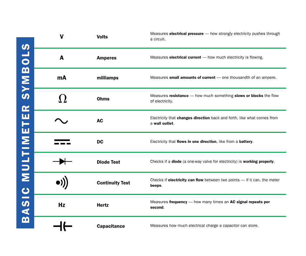A multimeter measures three primary electrical properties — voltage, current, and resistance.